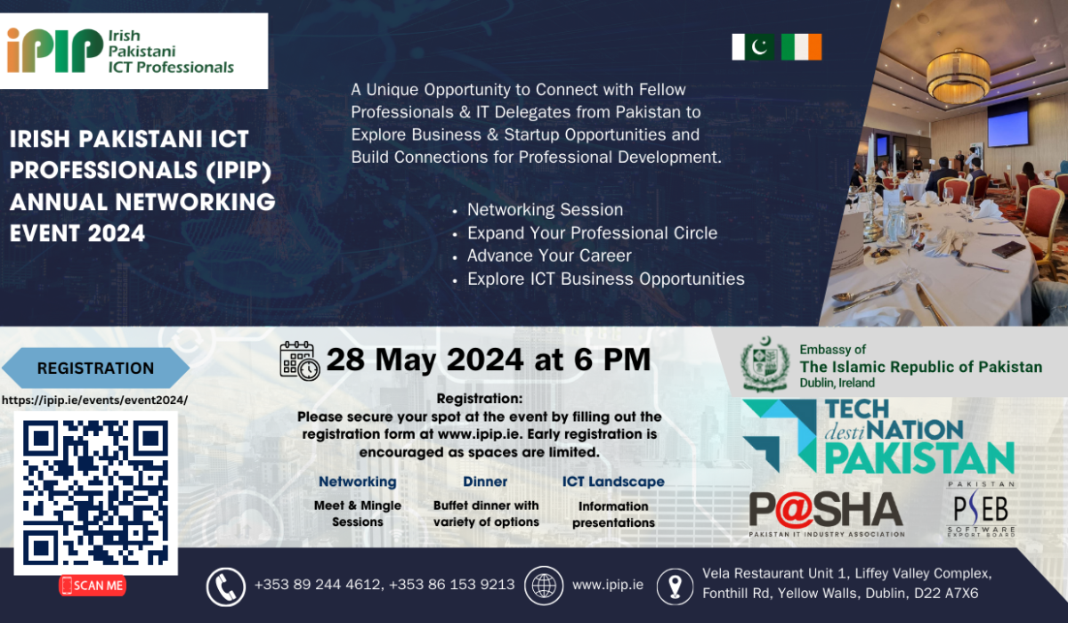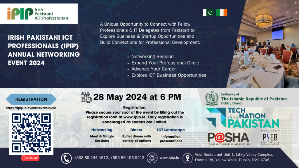 Welcome to the iPIP Pre-DTS Networking Event 2024, specially designed for Irish Pakistani ICT professionals, TECH DestiNATION PAKISTAN, PASHA & PSEB delegates from Pakistan, and representatives from the Pakistan Embassy. Join us for an evening of networking, and knowledge sharing over a delicious dinner, with effective “meet & mingle sessions” as we all explore professional and business opportunities in ICT sector.