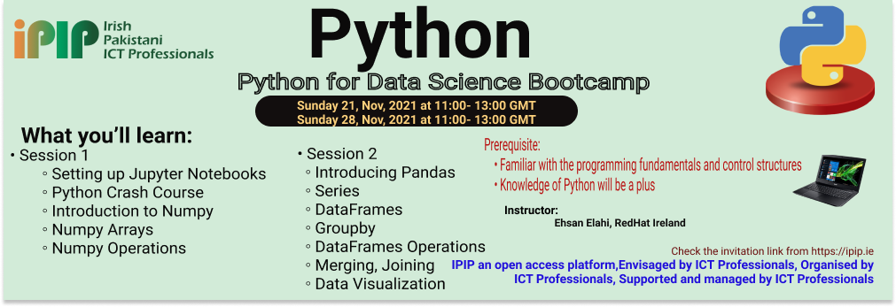 iPIP-Irish Pakistani ICT Professional Association is delighted to offer Instructor-Let “Python for Data Science Bootcamp”. This is a free two sessions camp where you will learn Python from an industry expert instructor.